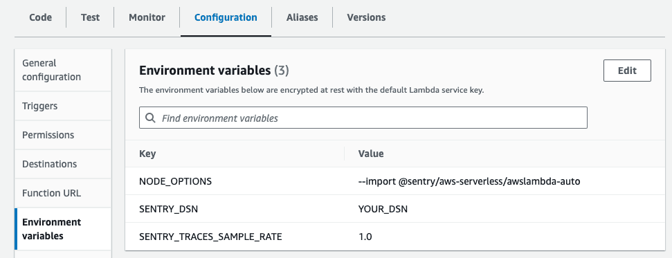 To further customize the SDK setup, you can also manually initialize the SDK in your lambda function. Due to ESM limitations, you need to initialize the SDK in a separate file and load it before your function starts. The benefit of this installation method is that you can fully customize your Sentry SDK setup in a Sentry.init call.