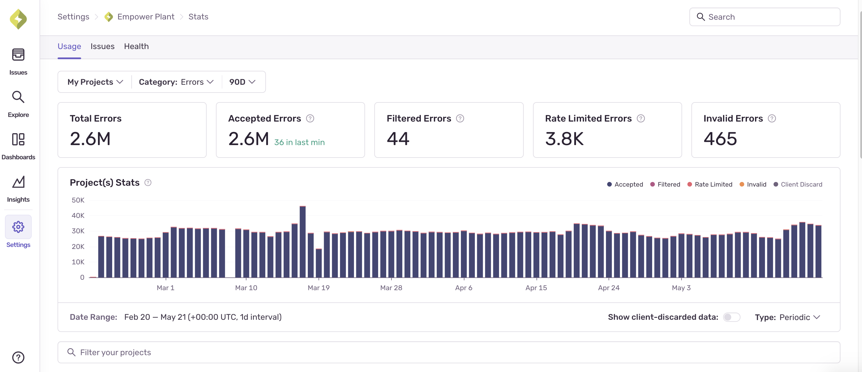 The Usage Stats tab displays details about the total amount of data Sentry has received across your entire organization for up to 90 days. The page breaks down the events (by project) into three categories: accepted, dropped, or filtered. Only accepted events affect your quota: