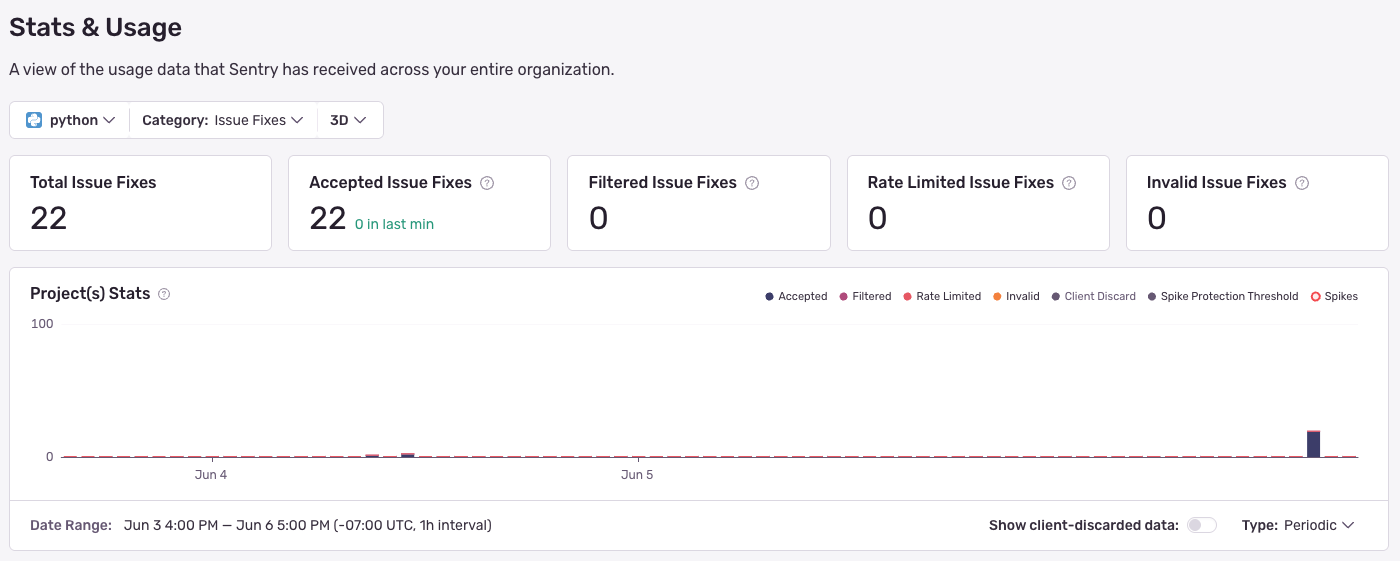 The Usage Stats tab displays details about the total amount of data Sentry has received across your entire org for up to 90 days. The page breaks down the events by project into three categories: accepted, dropped, or filtered. Only accepted scans and fixes affect your budget: